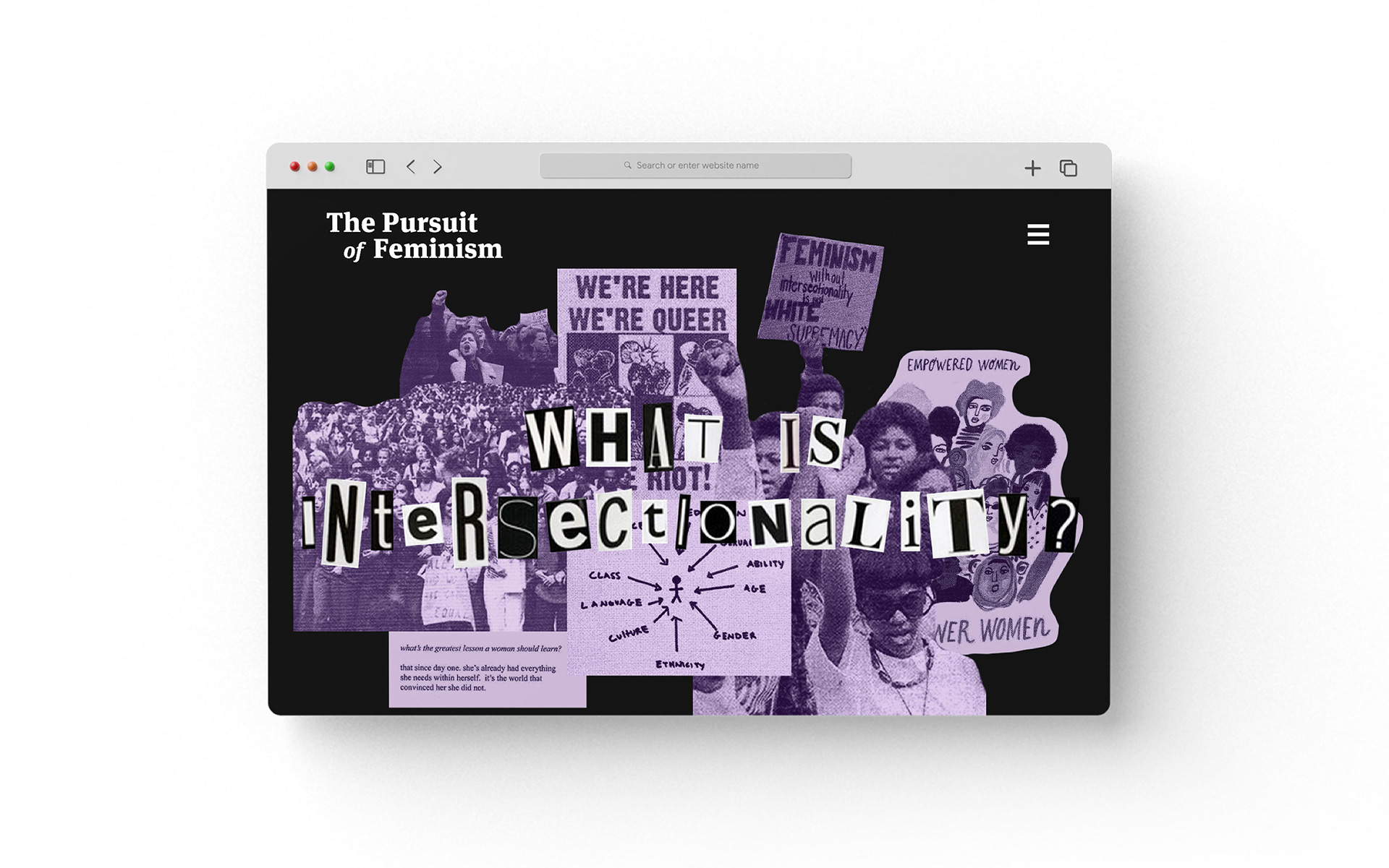 My objective with this project was to inform readers about the true meaning of feminism, debunk misconceptions, and offer resources on how to adopt feminist views. As this was a semester-long project, I was able to devote a large amount of time to researching feminism. I made sure to map out the information that I intended to feature on the site so that it could be as educational as possible. Since I wanted the content to be the main focus of the site, I worked to keep the typography clean and engaging.